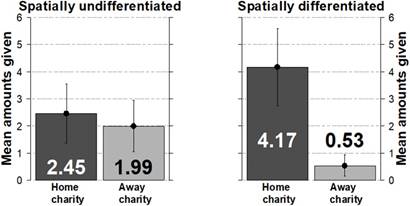 Die Ergebnisse zeigen deutlich: Wenn bekannt ist, dass eine Organisation lokal ist, spenden die Teilnehmer bevorzugt an diese lokale Einrichtung.